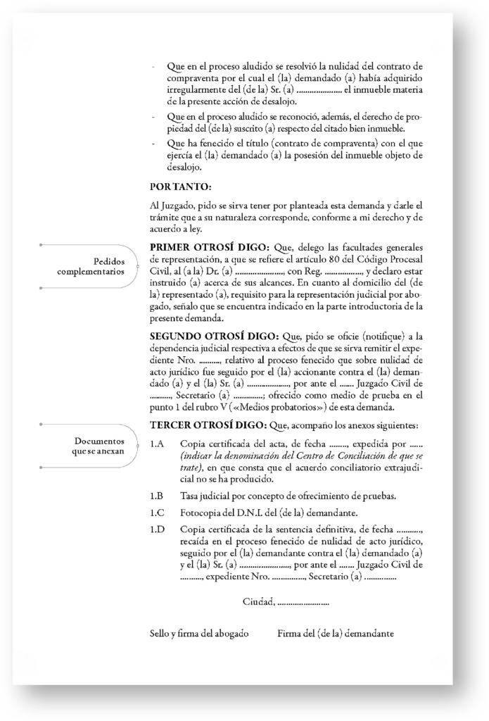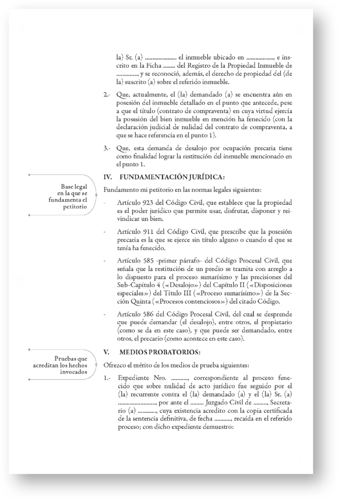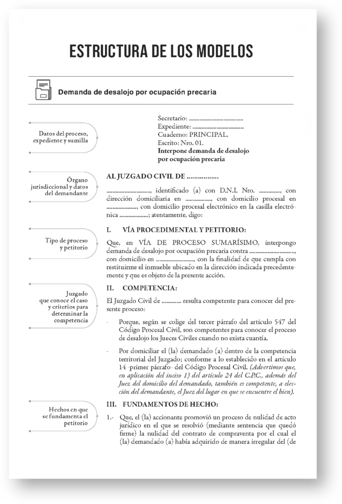 Los modelos de escritos están estructurados bajo las reglas que establece el Código Procesal Civil y las normas conexas. Pero también obedece a una organización racional: los escritos se han organizado con secciones delimitadas, que estructuran el contenido de forma lógica y ordenada. Así, cada sección cumple su función y se relaciona coherentemente con las demás.
